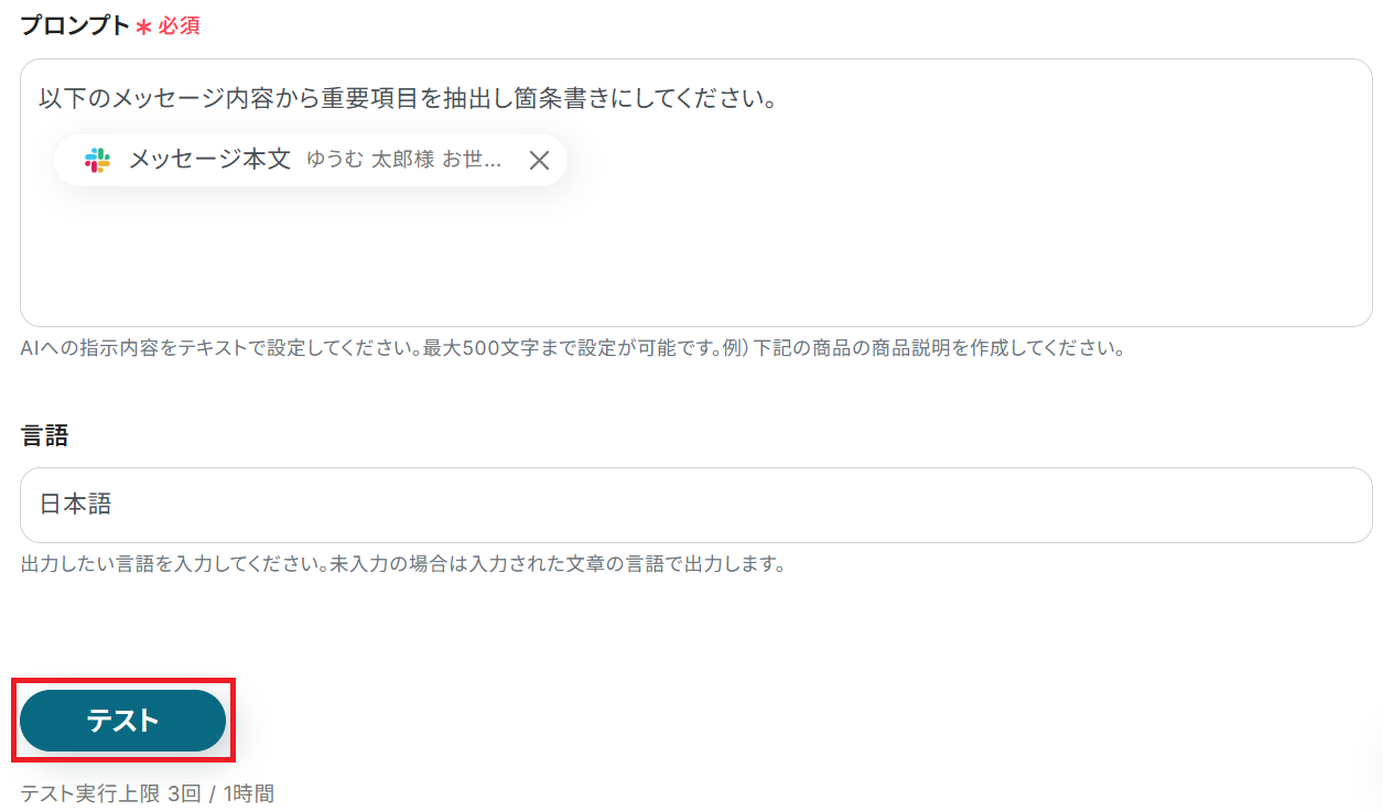 詳細設定に入ります。プロンプトは予め設定されている通りで大丈夫なので、任意で「言語」を入力してテストしましょう。