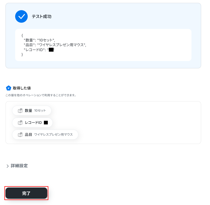 テストに成功するとテスト成功画面と取得した値に抽出結果が表示されますのでご確認ください。