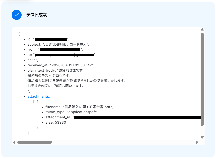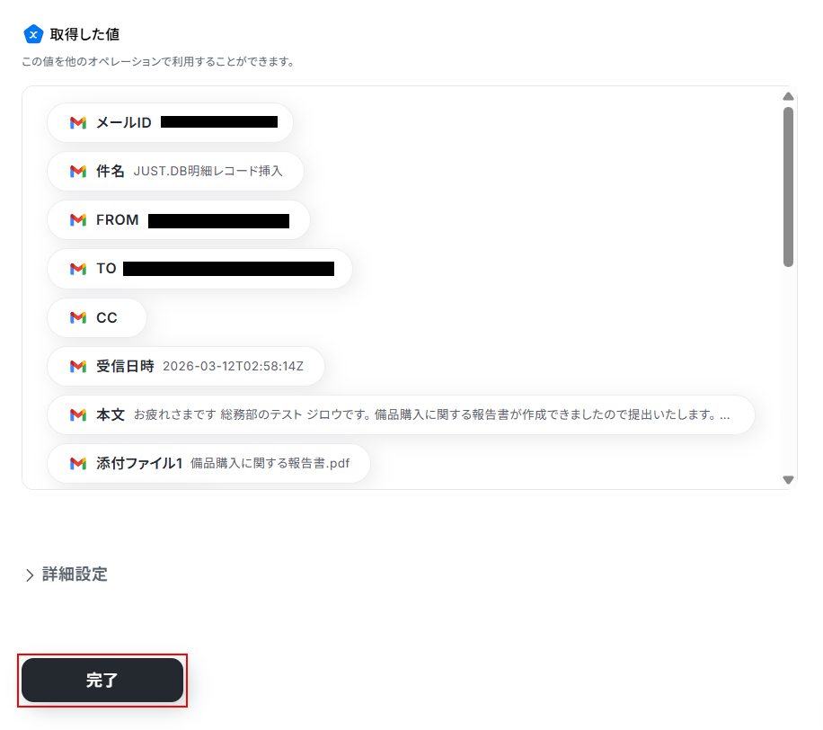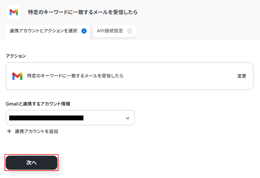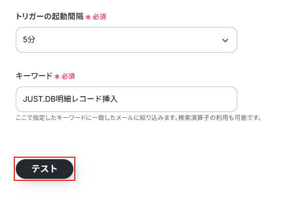 そのため、実際にテストを行うには、連携するアカウント情報に表示されていたGmailのアカウントでキーワードを含むメールを受信する必要があります。