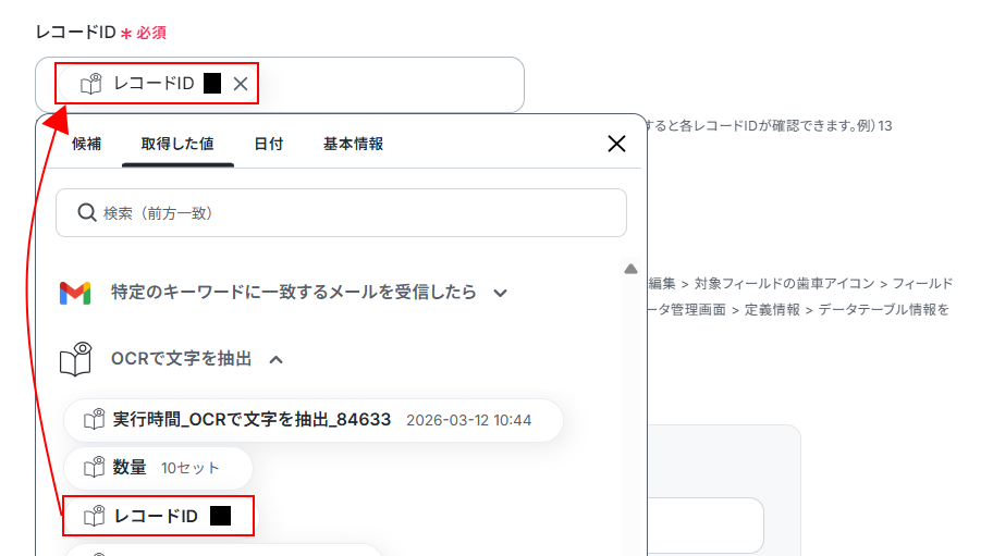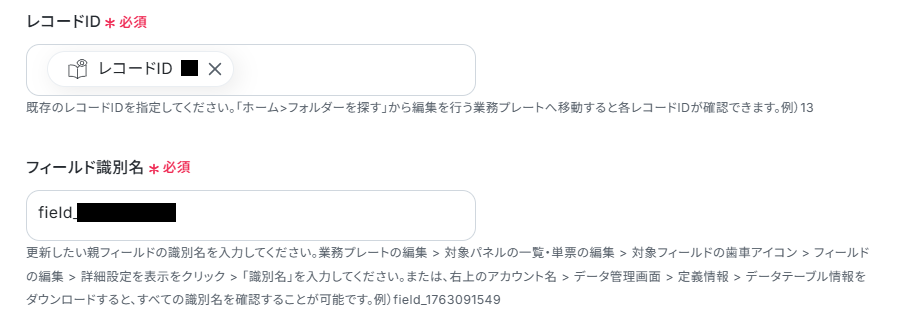 レコードに設定している文字列など上記の情報を利用してレコードID(親レコードID)を取得できます。