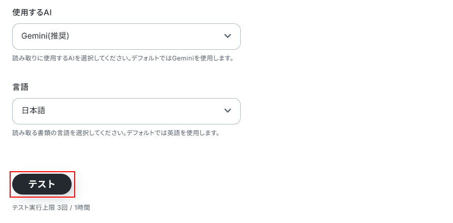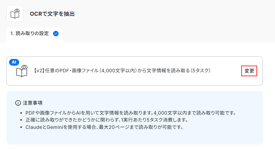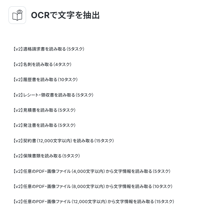 今回はデフォルトで設定されている【v2】任意のPDF・画像ファイル(4,000文字以内)から文字情報を読み取る(5タスク)を使用します。