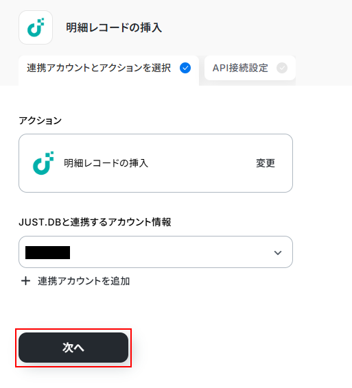 連携するアカウント情報にはステップ1で連携したアカウントか、連携時に使用していたYoomのアカウントが表示されます。