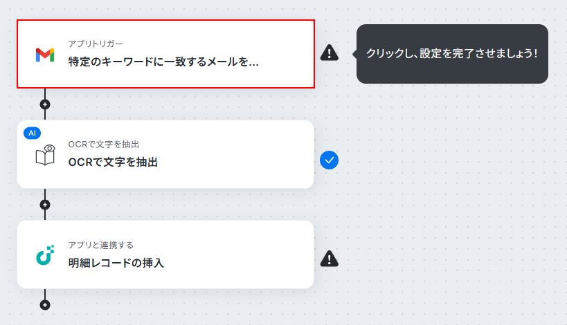 それではここから代表的な例として、GmailでPDFファイルを受信したら、OCR(光学的文字認識)で内容を読み取り、結果をJUST.DBの明細レコードに自動で挿入するフローを解説していきます!
