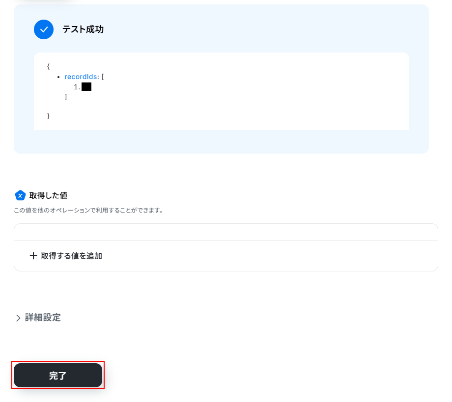 取得した値は実行した結果が設定される動的な値として利用できるため、このあとの設定でも使用します。