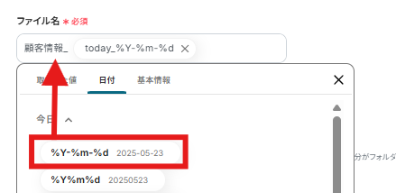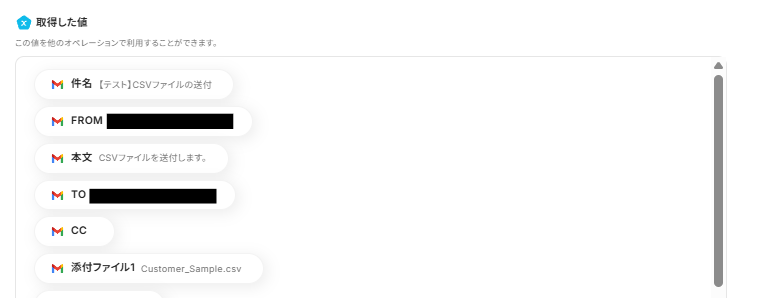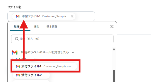 ファイル名には以下のように取得した値から、Gmailで受信したCSVファイルを入力します。