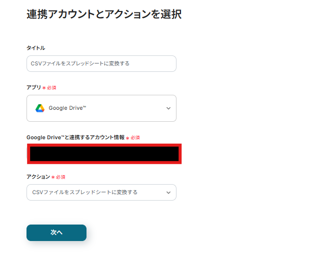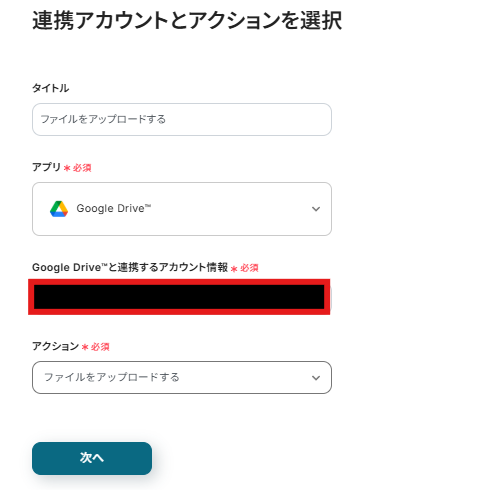 連携アカウントとアクションを選択する画面が表示されるので、今回連携するGoogleDriveのアカウントを確認し「次へ」をクリックします。