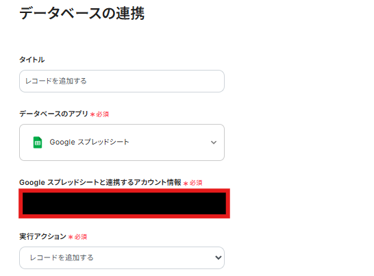 データベースの連携の箇所は、以下のようにレコードの値を追加したいGoogle スプレッドシートの情報を候補を使用し入力しましょう。