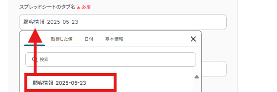 Google スプレッドシートのタブ名も、表示される候補から選択しましょう。