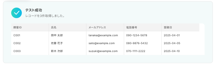 「テスト」をクリックし、実際にレコードが取得できているか確認しましょう。