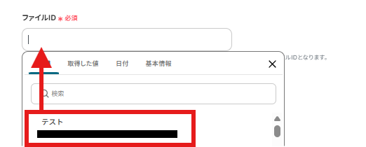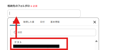 格納先のフォルダIDは以下のように、表示される候補から選択しましょう。