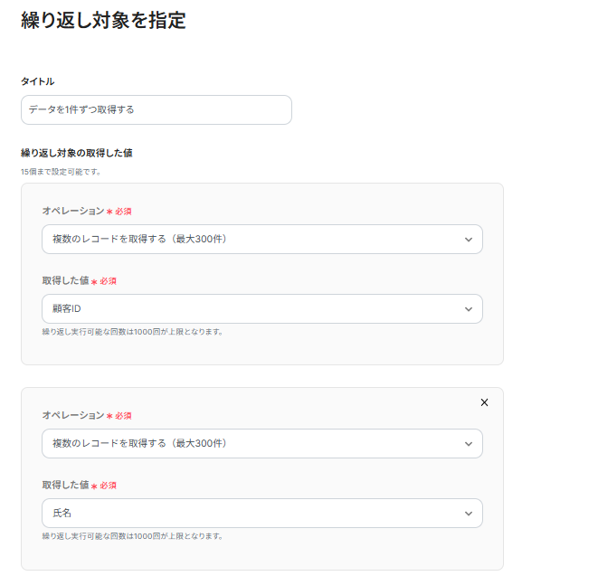 繰り返し対象を指定の画面では、「顧客ID」など項目ごとに、繰り返しレコード情報を取得するための設定を行っています。