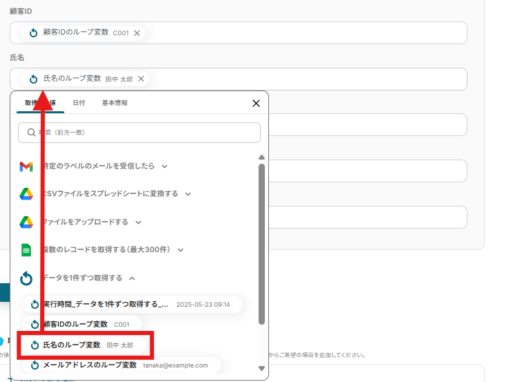 各項目に、「データを1件ずつ取得する」から各項目のループ変数を入力しましょう。