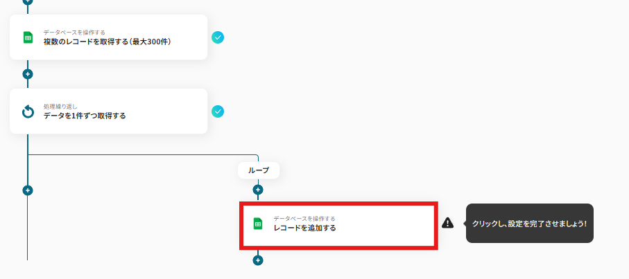 ※「同じ処理を繰り返す」オペレーション間の操作は、チームプラン・サクセスプランでのみご利用いただける機能となっております。フリープラン・ミニプランの場合は設定しているフローボットのオペレーションやデータコネクトはエラーとなりますので、ご注意ください。