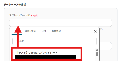 スプレッドシートIDには以下のように表示される候補から、先ほど変換したGoogle スプレッドシートを選択します。