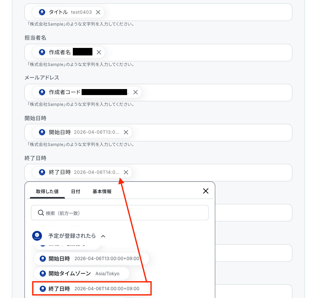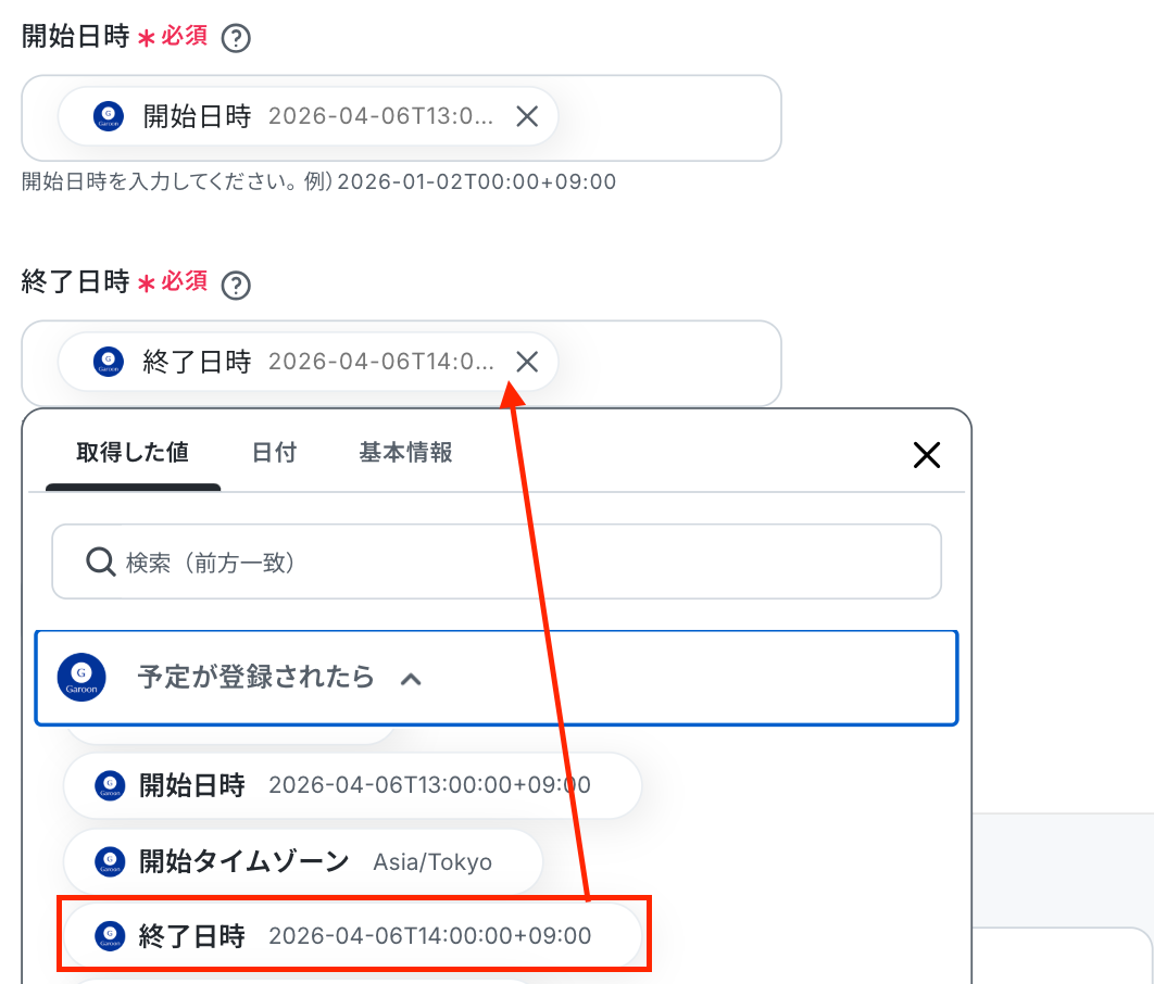 「開始日時」と「終了日時」は、Garoonのオペレーションで取得した値を引用して設定しましょう。
