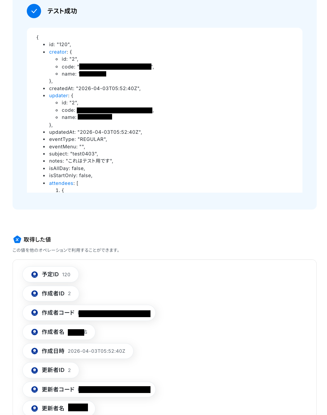 テストに成功すると、取得した値が表示されます。