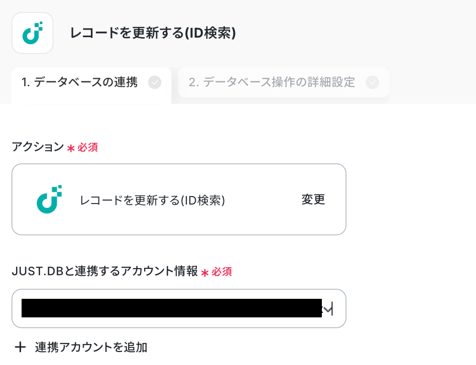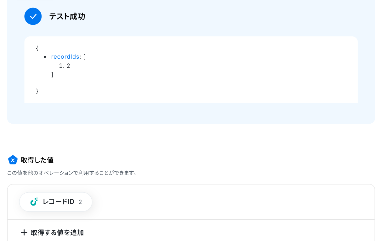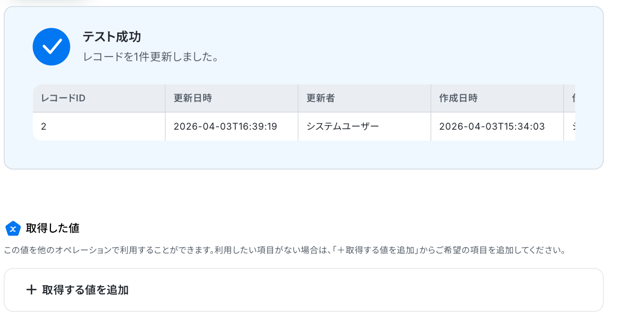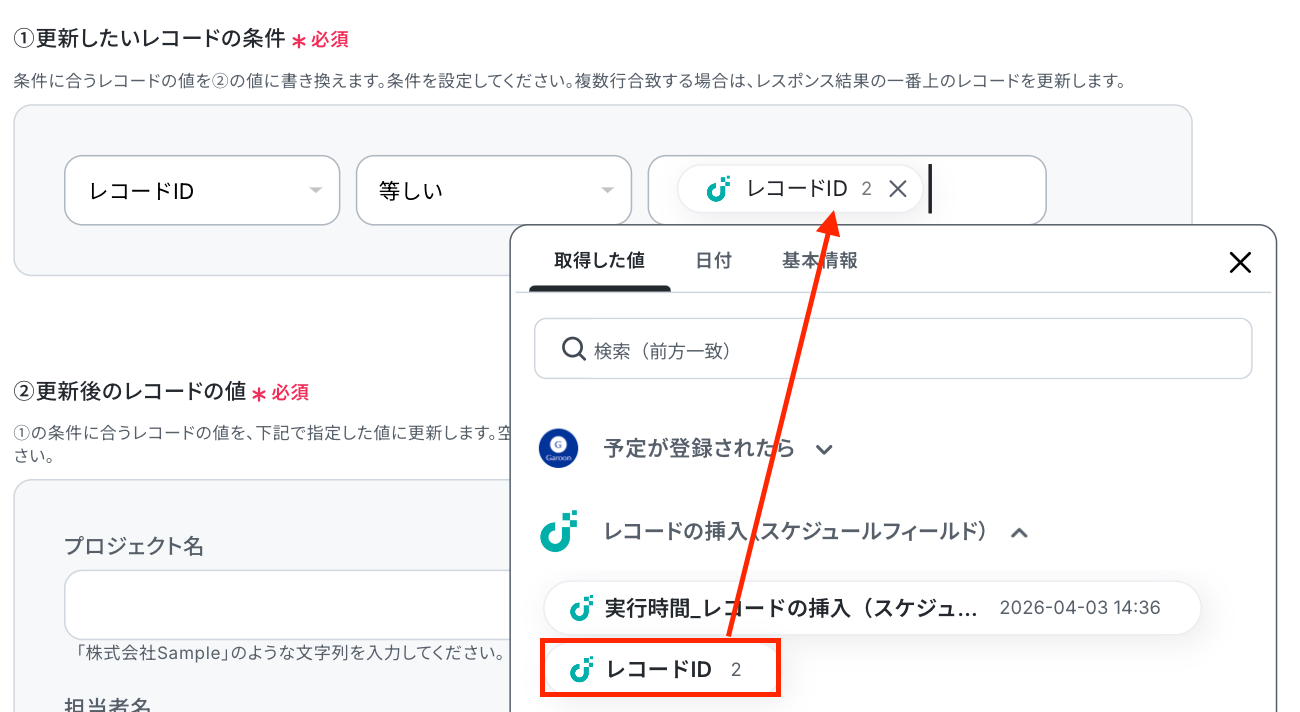 「レコードID」が、先ほどのステップで取得した値と等しい場合に更新するよう設定しました。