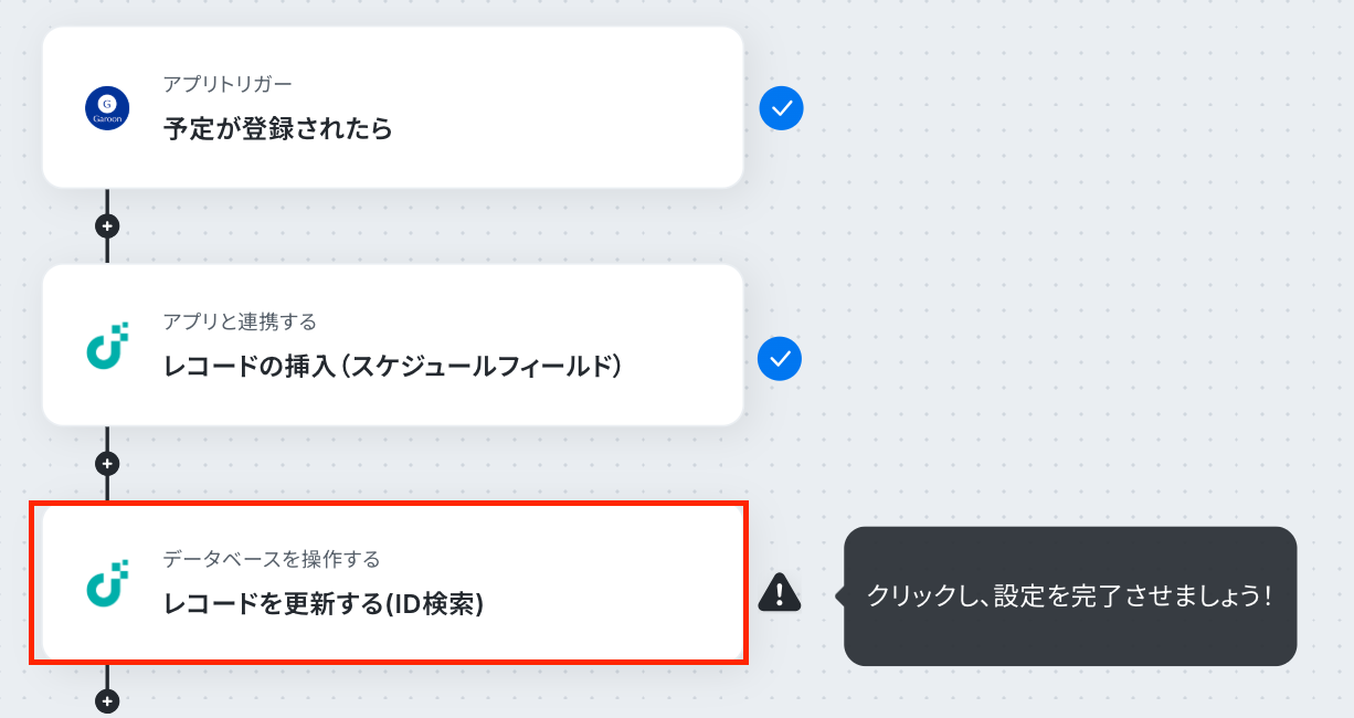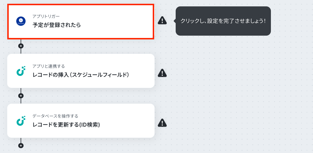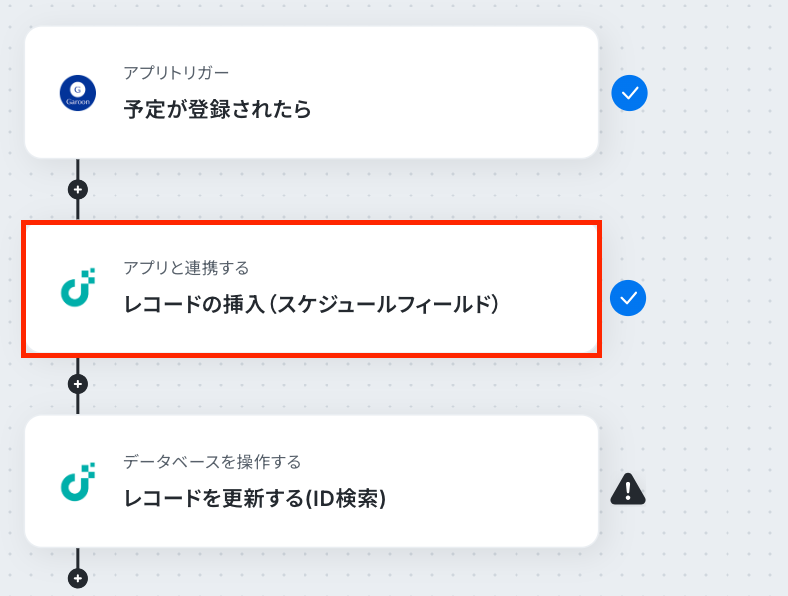 それではここから代表的な例として、Garoonに予定が登録された際に、JUST.DBのスケジュールフィールドにレコードを自動で挿入するフローを解説していきます!