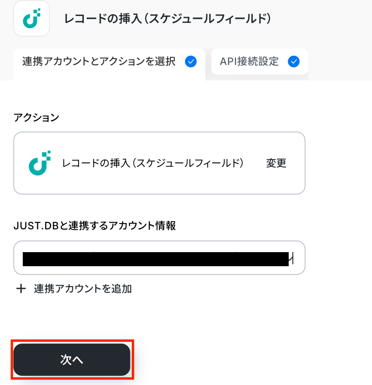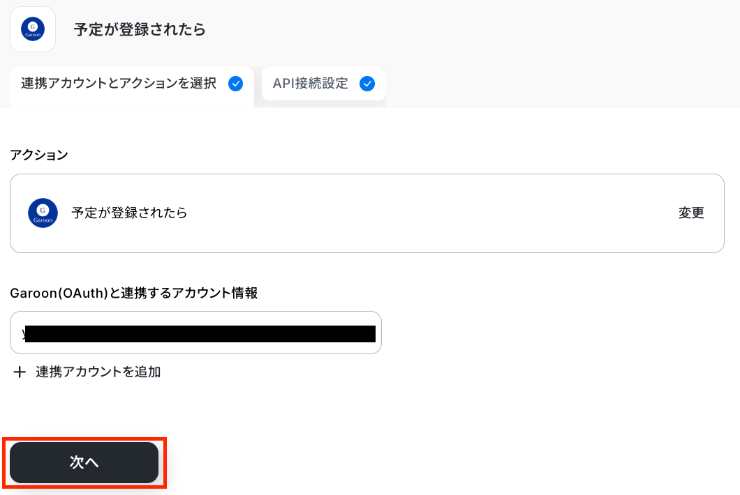 アクションはそのままで、連携するアカウント情報を確認します。