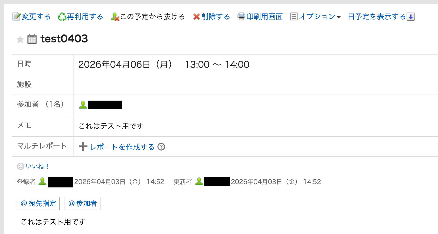 Garoonの画面に移動して、テスト用として、予定を登録しましょう。