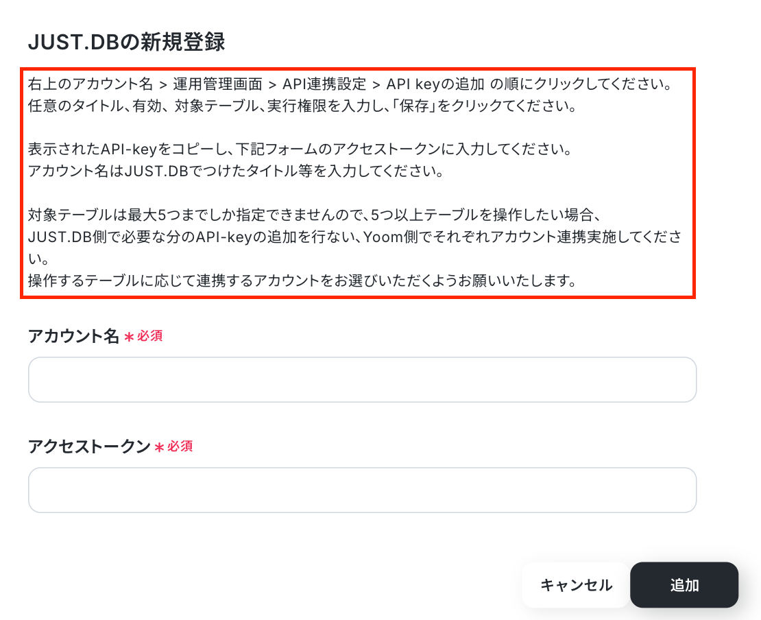 アカウント名とアクセストークンを入力し、「追加」をクリックしたら完了です。
