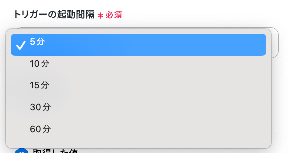 Yoomの画面に戻って、トリガーの起動間隔を設定します。