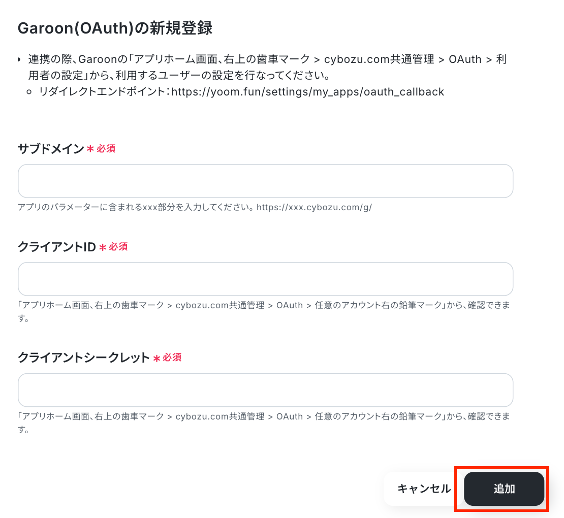 Garoonの新規登録画面で、必須項目を入力して「追加」を押します。