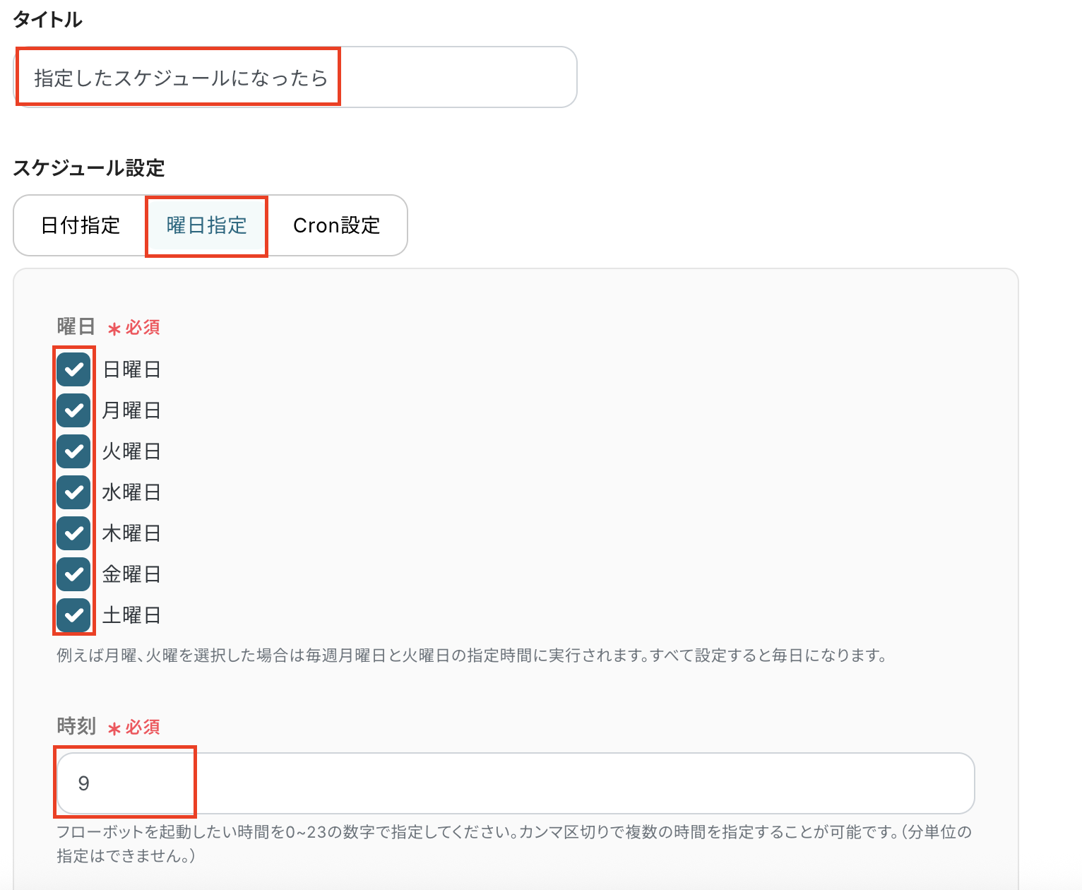 スケジュール設定は「曜日指定」を選択して、フローボットを起動させたい曜日にチェックをし、時刻を設定しましょう。
