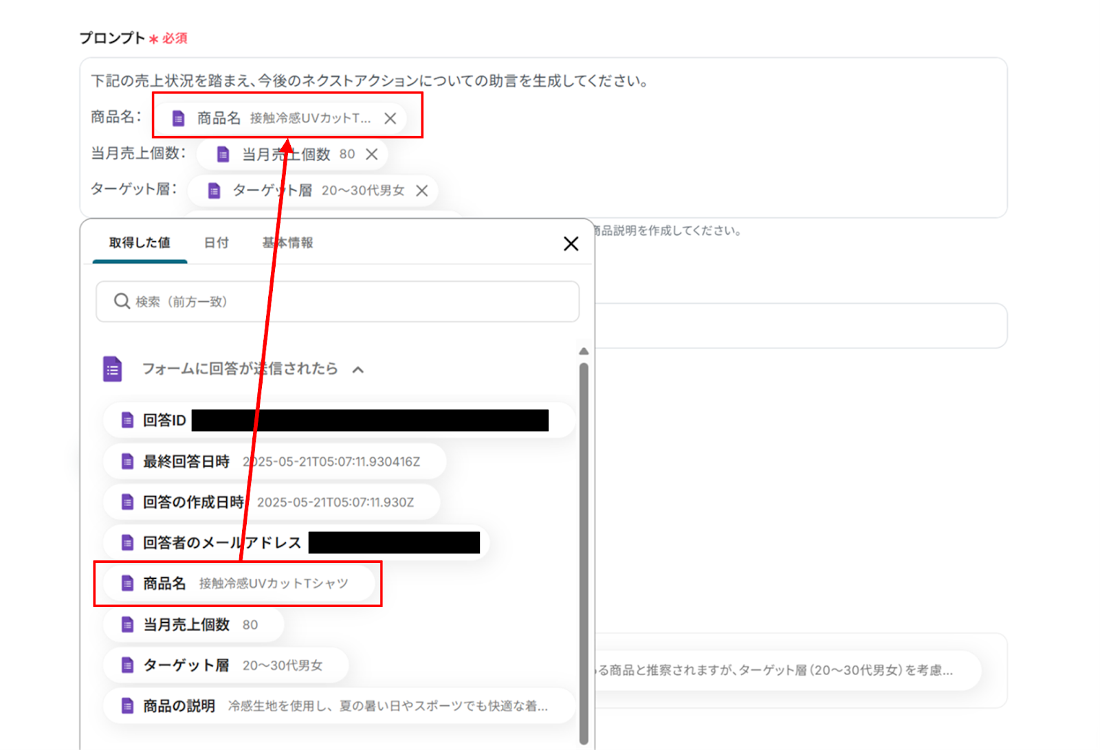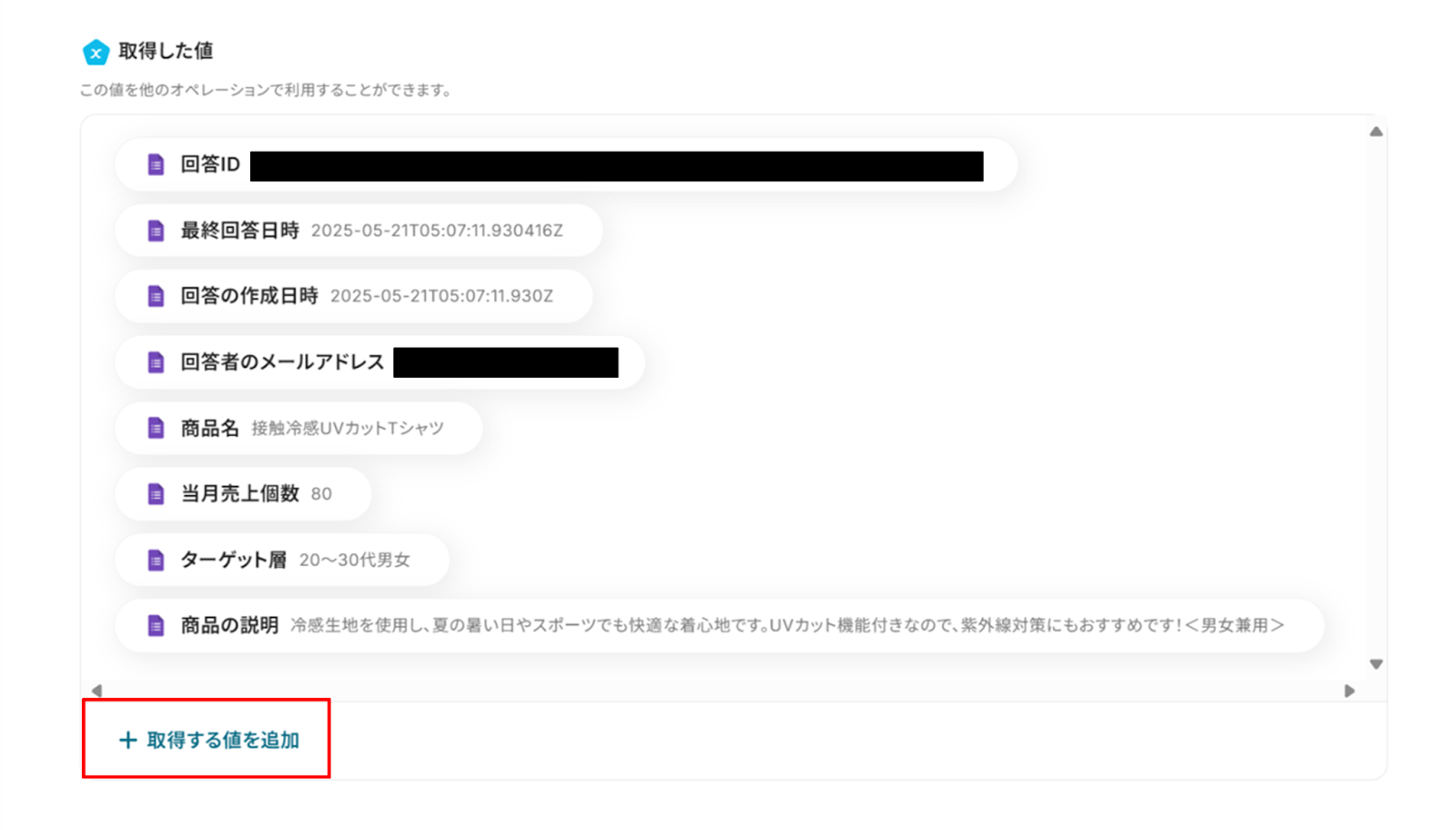 また、Googleフォームをトリガーに設定した場合はテストが成功しても自動で質問内容が表示されない場合があります。 その場合は「+取得する値を追加」をクリックして回答データを取得しましょう。 回答内容の詳しい取得方法については、下記のサイトをご確認ください。