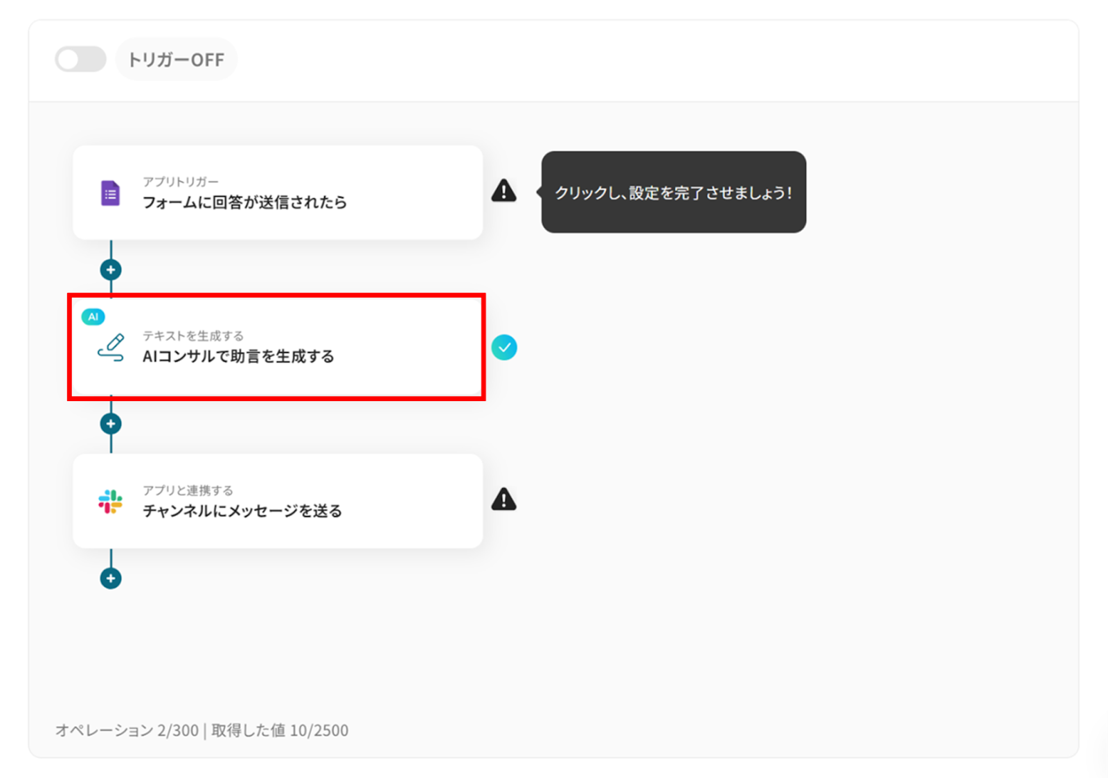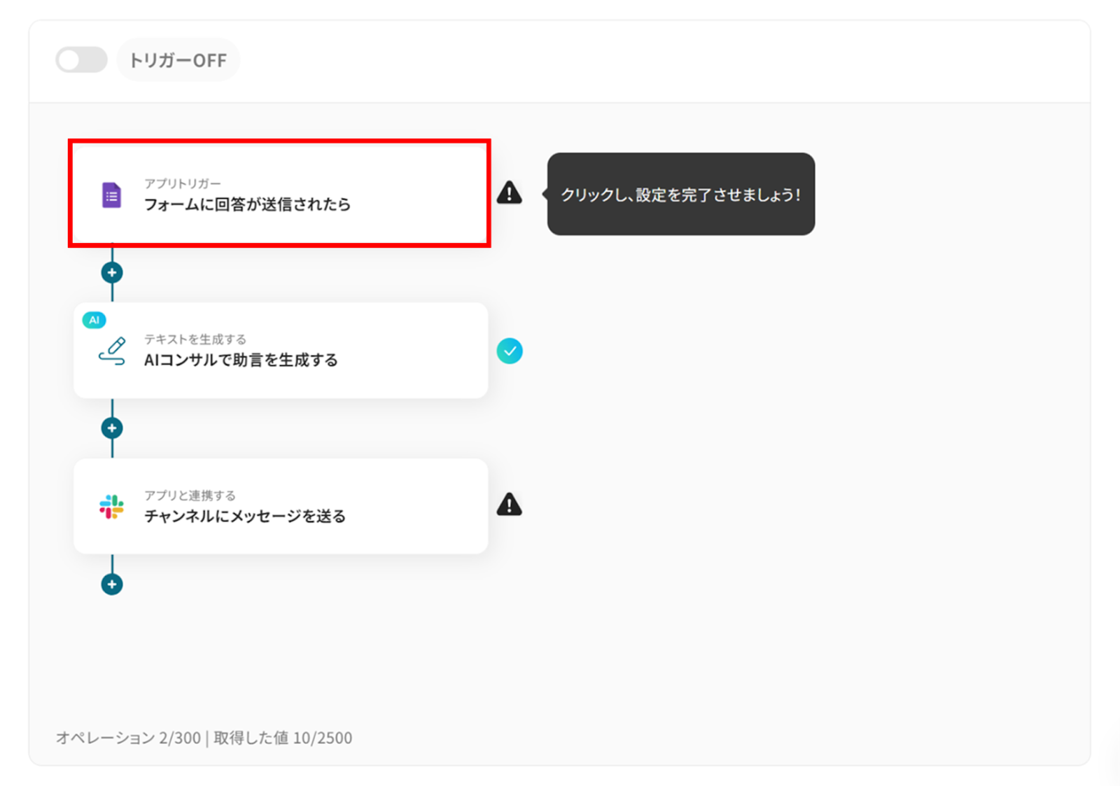 お疲れ様でした!これですべての設定が完了です。 設定が完了すると以下のようなメニューが表示されるので、トリガーをONにします。 実際にフローボットを起動して、Googleフォームで回答すると、AIコンサルが提案を生成しSlackに通知されているか確認してみてくださいね!