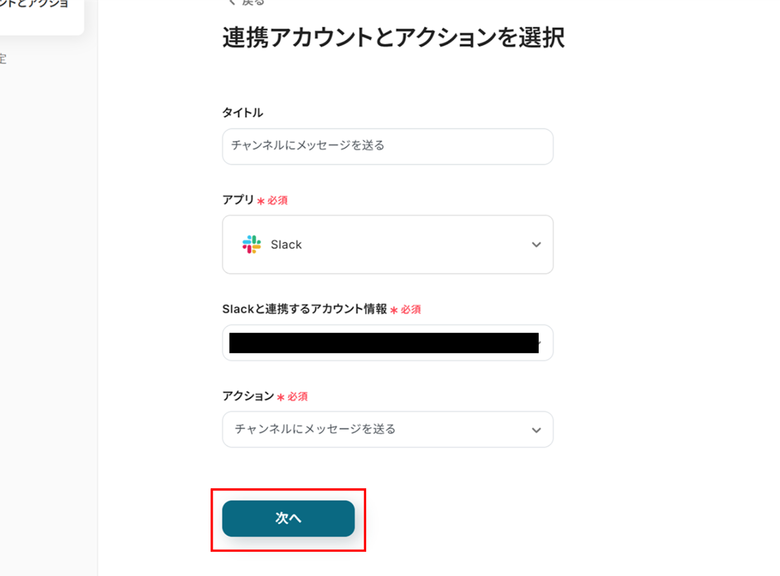 (2)Slackの「連携アカウントとアクションを選択」画面から、Slackと連携するアカウント情報に誤りがないかを確認し、アクションは「チャンネルにメッセージを送る」のままで「次へ」をクリックします。