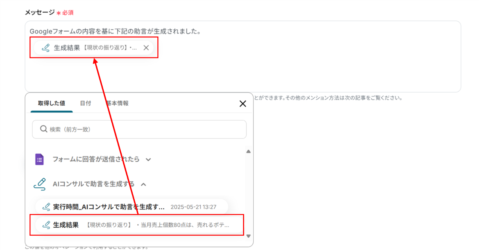 下へ進み、メッセージに入力した内容がSlackに送信されます。 文中に取得した値から「生成結果」を選択します。 入力が終わったら「テスト」をクリックしましょう!