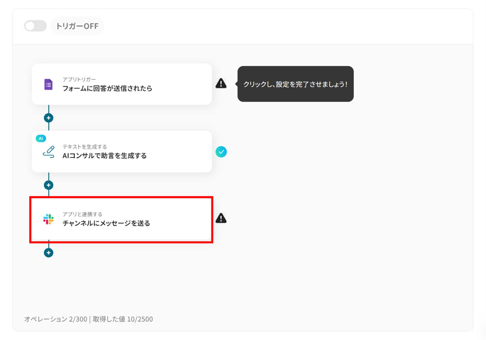 アプリトリガー、AI機能を使ってテキストを生成する、Slackのチャンネルにメッセージを送る設定