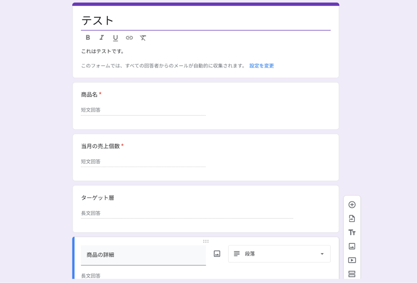 始める前に、予めGoogleフォームに専用のフォームを作成しておきましょう! それでは、Yoomに戻り、Googleフォームと連携して、回答が送信された際の設定を行います!