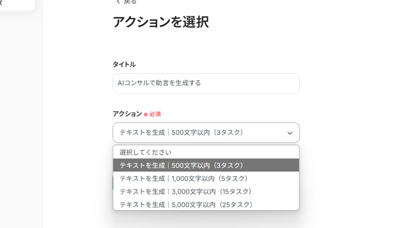 (2)「アクションを選択」画面から、生成するテキストの文字数をプルダウンから選択し、「次へ」をクリックします。