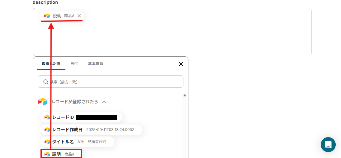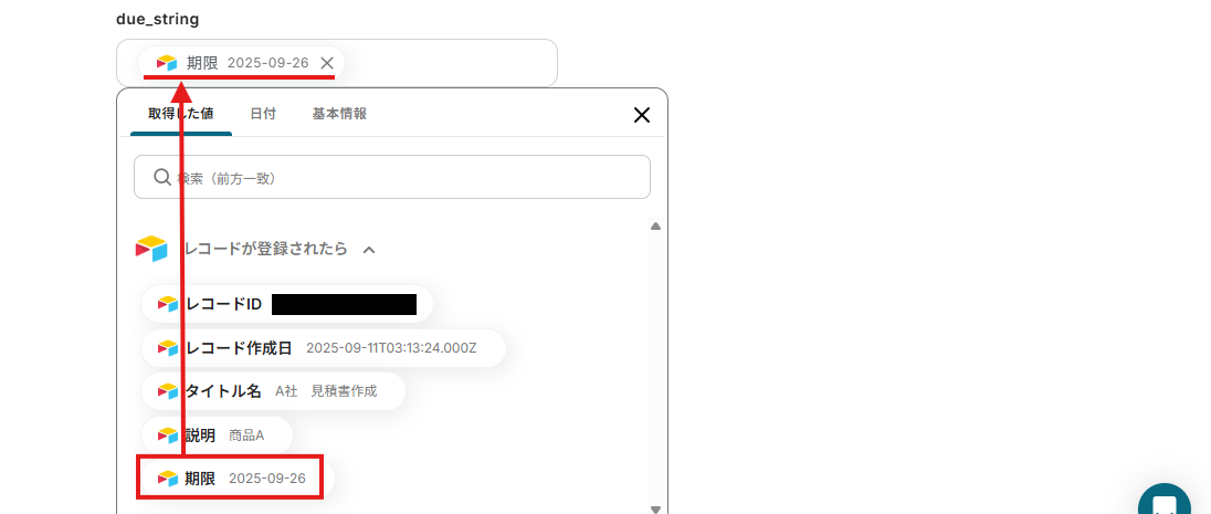 descriptionとdue_string(タスクの期限日)も下記画像の通り、Airtableに登録された「説明」と「期限」が自動で登録されるように設定されているので確認しましょう。