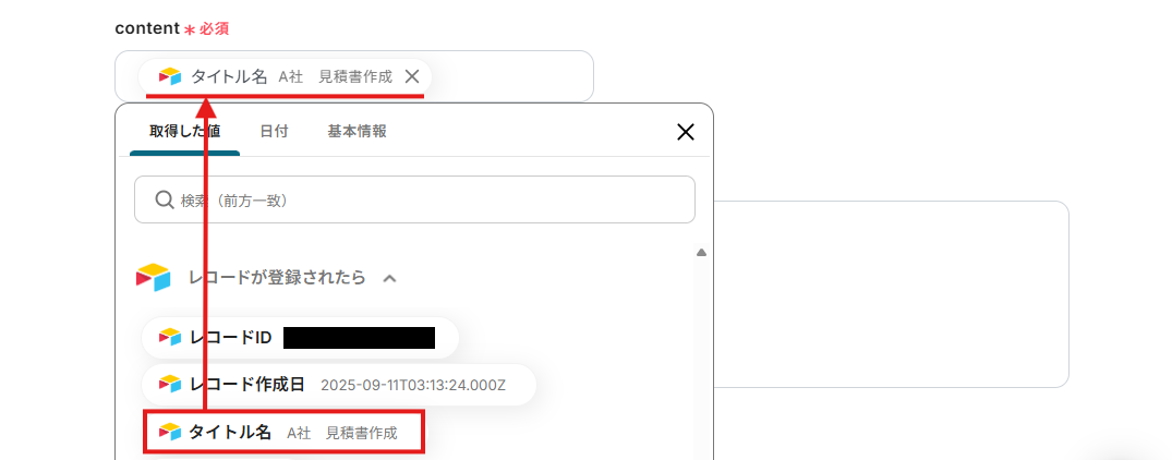 contentは、Airtable偽コードが登録されたら「タイトル名」自動で引用できるように設定されています。