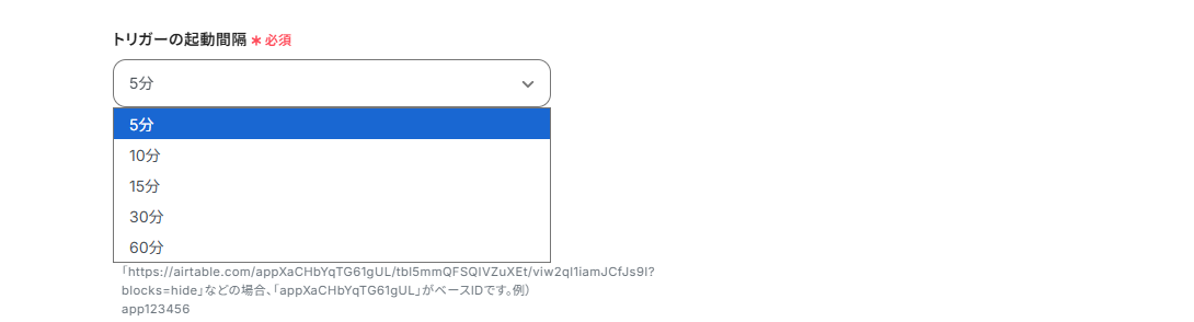 トリガーの起動タイミングは、5分、10分、15分、30分、60分のいずれかで設定できます。