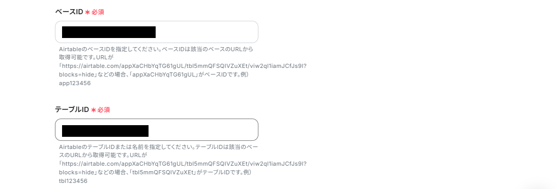ベースIDとテーブルIDは、枠外の注釈を参考にしAirtableのURLからコピーし設定してください。