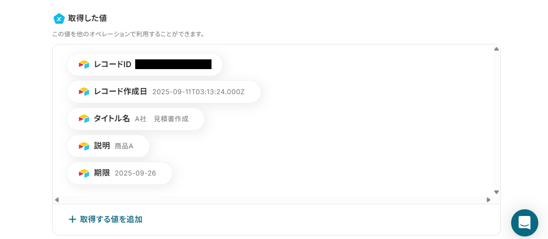 レコードの情報が取得した値に表示されるので、正しく取得されているか確認しましょう。