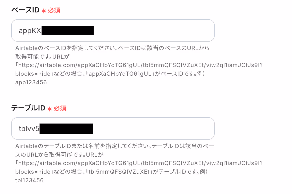 Airtableで事前準備で作成したテーブルを開き、表示されるURLから下記画像を参考にベースID(appで始まる文字列)とテーブルID(tblで始まる文字列)をコピーしそれぞれの入力欄に貼り付けてください。