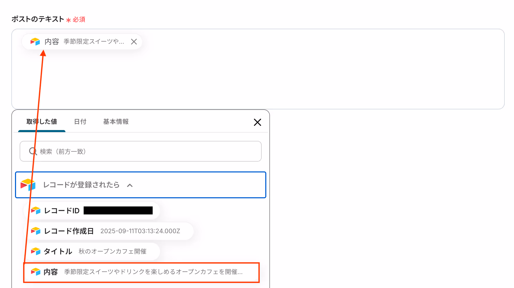 また、トリガーのステップで取得するAirtableのレコード内容にハッシュタグやメンション先が記載されていれば、その内容を取得し、動的に投稿へ自動反映させることも可能です。