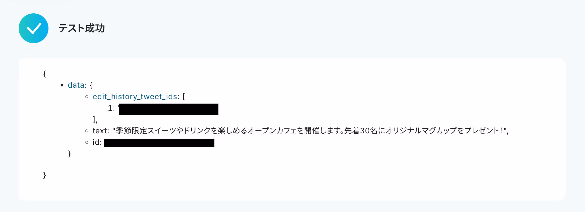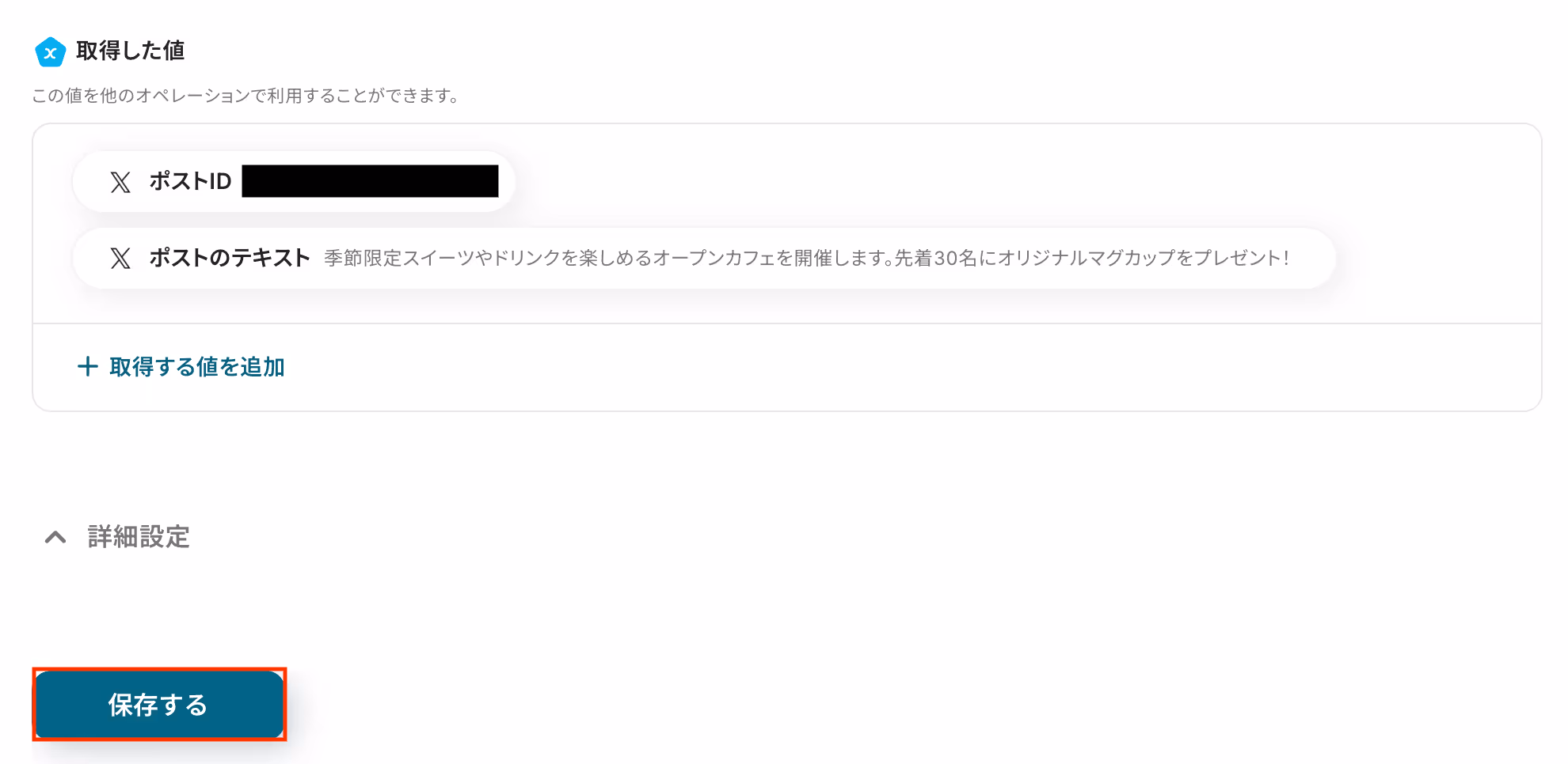 つまり、取得した値を活用せず設定を行うと毎回同じ内容のポストがX(Twitter)に投稿されてしまうので注意が必要です。