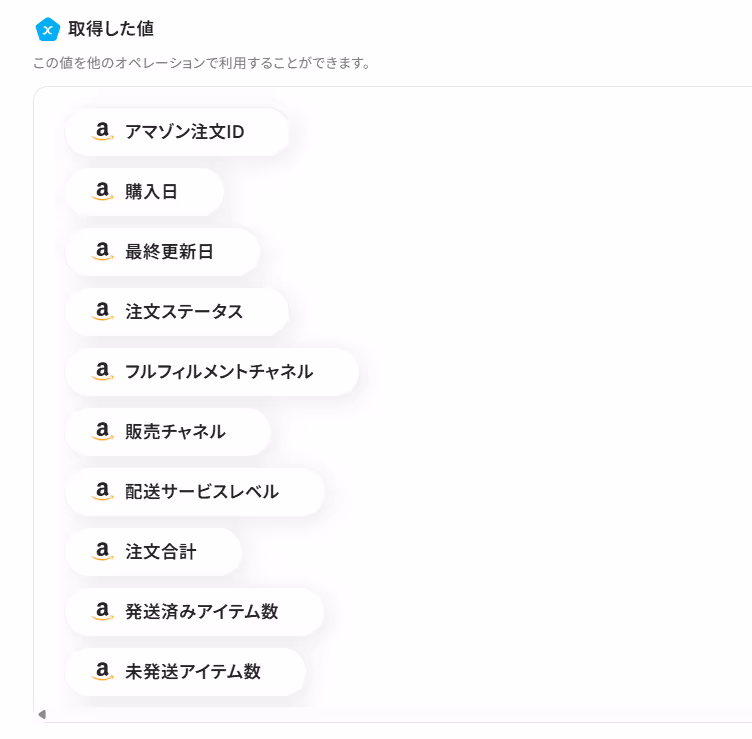 「注文ID」は、入力欄をクリックして表示される取得した値から「アマゾン注文ID」を選択してください。
