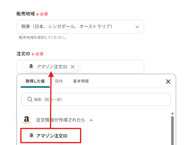 「注文ID」は、入力欄をクリックして表示される取得した値から選択してください。