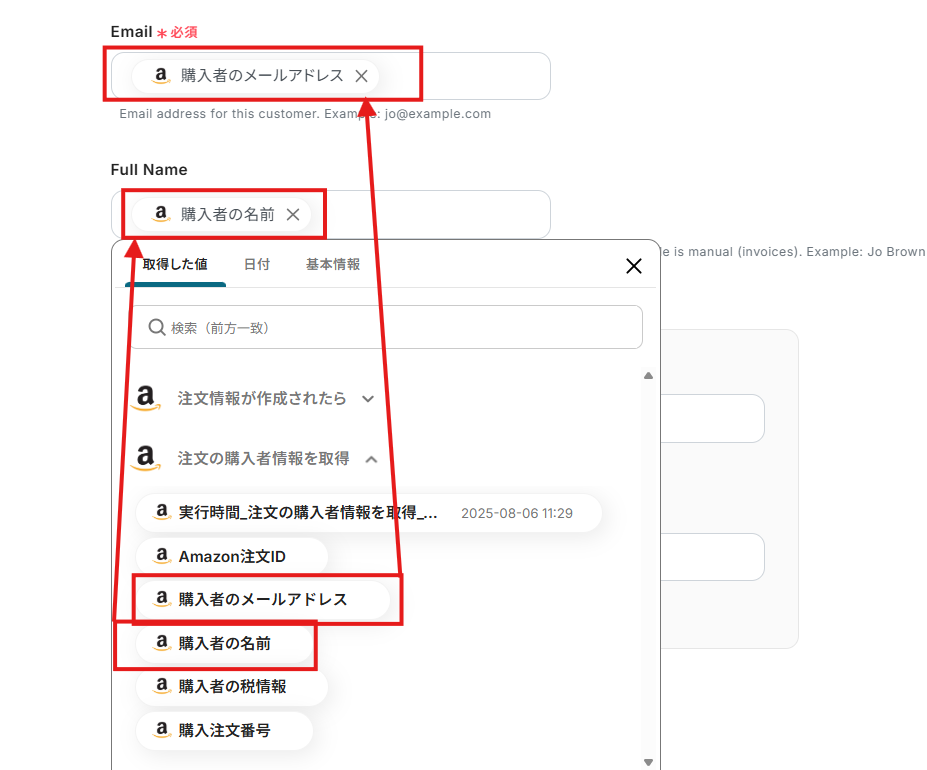 「Email」「Full Name」は、入力欄をクリックして表示される取得した値から選択してください。