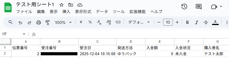 ここでGoogle スプレッドシートを確認してみます。 このように、新しい行へNEXT ENGINEの受注伝票情報が連携されました!
