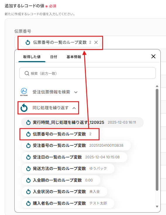 追加するレコードの値:入力欄をクリックし、以下のように該当する項目を選択してください。