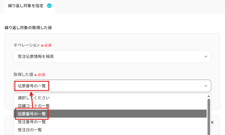 オペレーション:「受注伝票番号を検索」に設定