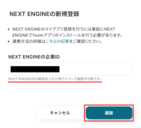 マイアプリ欄からNEXT ENGINEを選択すると以下の画面が表示されるので、赤線の通り入力しましょう。 企業IDの確認方法はNEXT ENGINEのマイアプリ登録方法 をご覧ください。